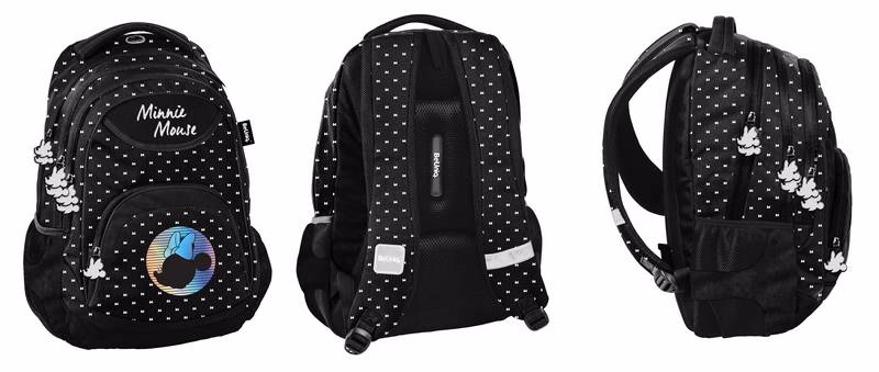 Fekete hátizsák, amelyet ezüst színű kis masnik és egy Minnie egér hologramos embléma díszít.