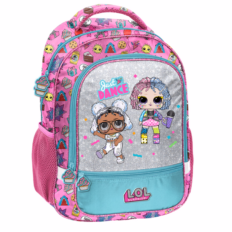 Vidám rószaszín és kék mintás Lol babás hátizsák.