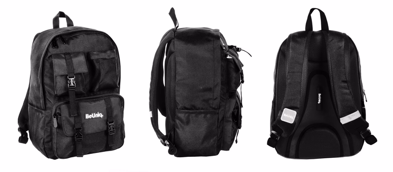 Backpack, compartment with partition, three front pockets, two side fabric pockets, regulated shoulder straps,upper handle, reflective elements, padded molded back, water repellent fabric, beuniq lining.