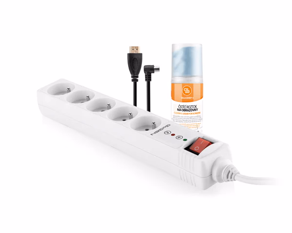 Gallery showing 6 images of Hosszabbító elosztó kapcsolóval, túlfeszültség védelemmel, 5 aljzat 1,5m, + tisztítókészlet, 4K HDMI, COAX kabel