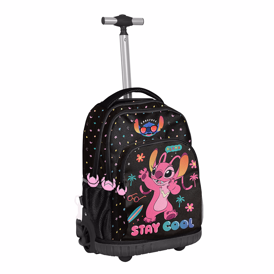 Fekete alapszínű Stiches iskolatáskát színes motivumok díszítik, amelyek különleges megjelenést kölcsönöznek a táskának.