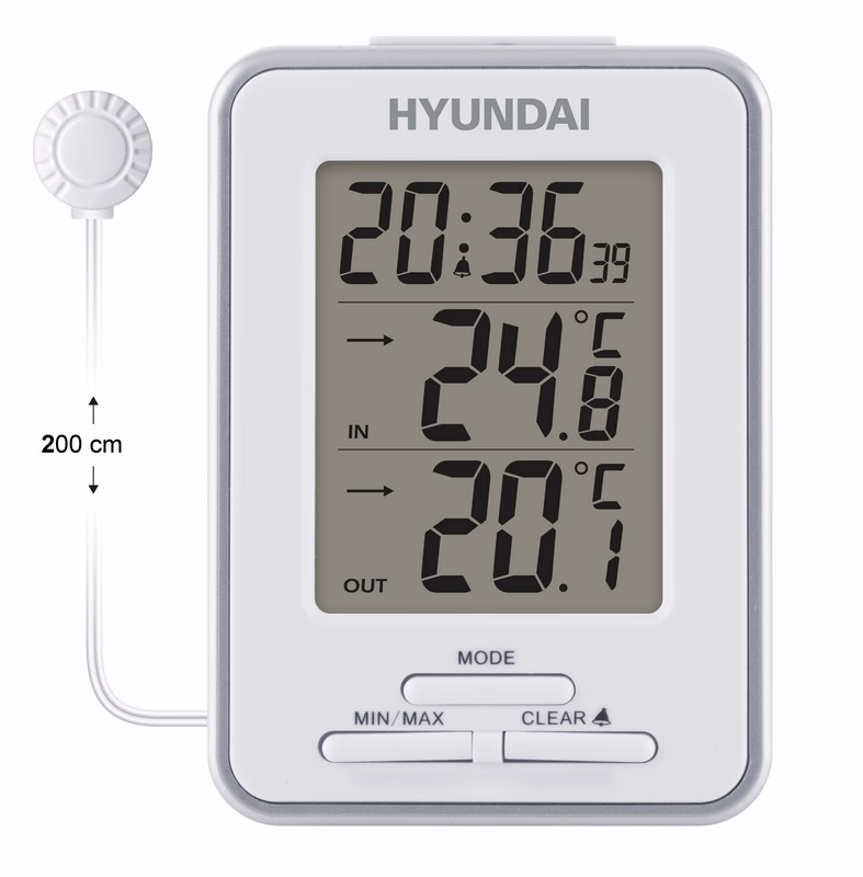 Hyundai meteorológiai állomás, fehér Hőmérő vezeték nélküli érzékelővel, hossza 2 m, idő, ébresztőóra, max. és min. beltéri / kültéri hőmérséklet