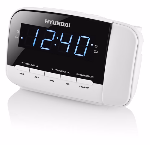 Hyundai rádiós ébresztőóra, fehér LED kijelzővel, digitális FM/AM tuner, falra való idő vetítés, 2 független ébresztő, SNOOZE, tápellátás 230V / 50 Hz