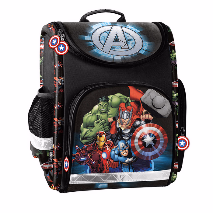 Marvel szuperhős csapatával díszített iskolatáska praktikus elrendezésű, nagy fő rekesszel és kisebb zsebekkel, amelyek lehetővé teszik a tankönyvek és füzetek megfelelő rendszerezését.