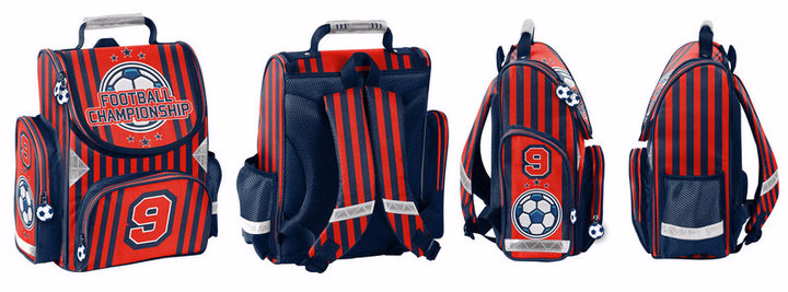 School bag, one compartment with partition, one front pocket, 2 side pockets- one mesh , the other one polyested with zipper, stiff, ergonomic back covered with mesh, profiled shoulder straps with mesh, stiff bottom, reflective elements,print, elastic at side pocket.