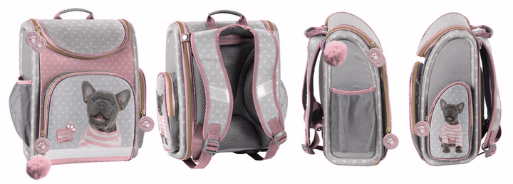 Light school bag (only 850 g), one compartment with partition, side mesh pocket, side zipped pocket, stiff, ergonomic back covered with mesh, profiled shoulder straps with mesh, stiff bottom, reflective elements;print with selective glitter, glitter piping and glitter elastic at the side pocket.