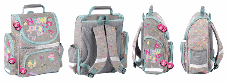 School bag, one compartment with partition, one front pocket, 2 side pockets- one mesh , the other one polyested with zipper, stiff, ergonomic back covered with mesh, profiled shoulder straps with mesh, stiff bottom, reflective elements,selective glitter, glitter piping.