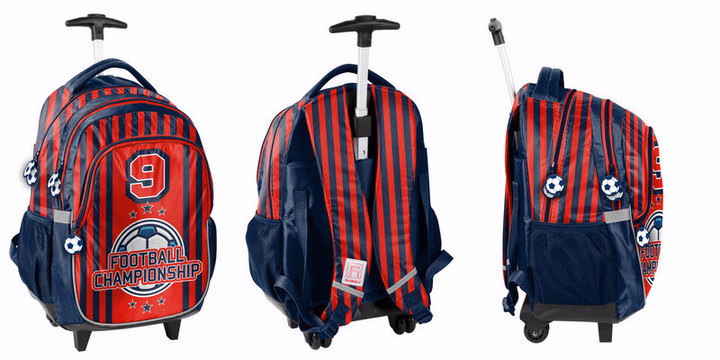 Trolley backpack with shoulder straps, two compartments,one front pocket, two side mesh pockets, upright pull handle, two wheels, profiled shoulder straps.