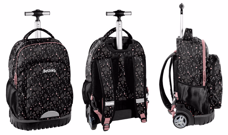 Trolley backpack, two compartments, one front pocket, two side mesh pockets, adjustable, padded shoulder straps, reflective elements, retractable shoulder straps, upright pull handle, durable wheels, stiffened elements, personal card pocket, water repellent fabric