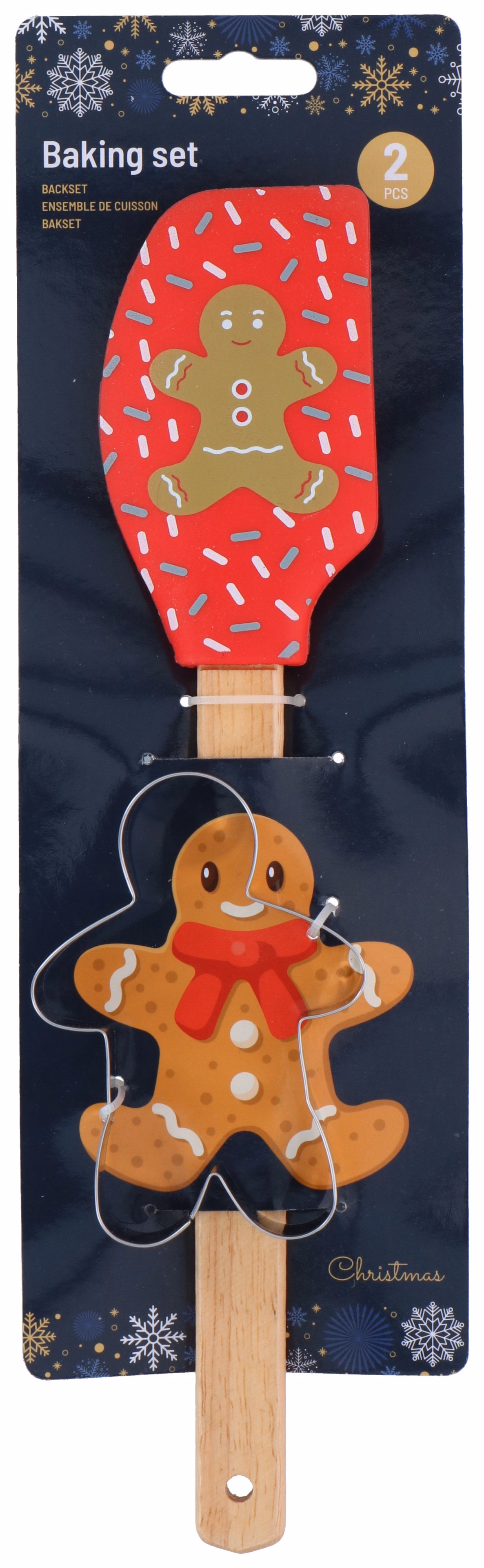 Karácsonyi süteménykészítő készlet. 1 sütiember mintás, fanyelű szilikon spatulát, valamint rozsdamentes acélból készült sütikiszúrót tartalmaz.
