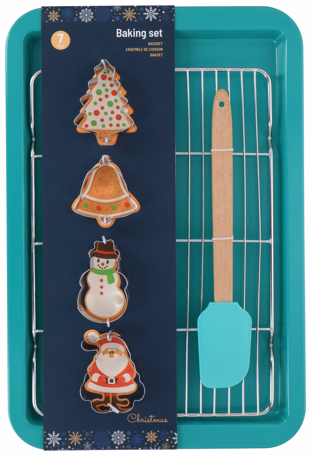 A készletben található egy sütő tálca, egy hűtőrács, egy szilikon spatula valamint 4 darab fém kiszúró: fenyőfa, csengő, hóember és mikulás alakúak.
