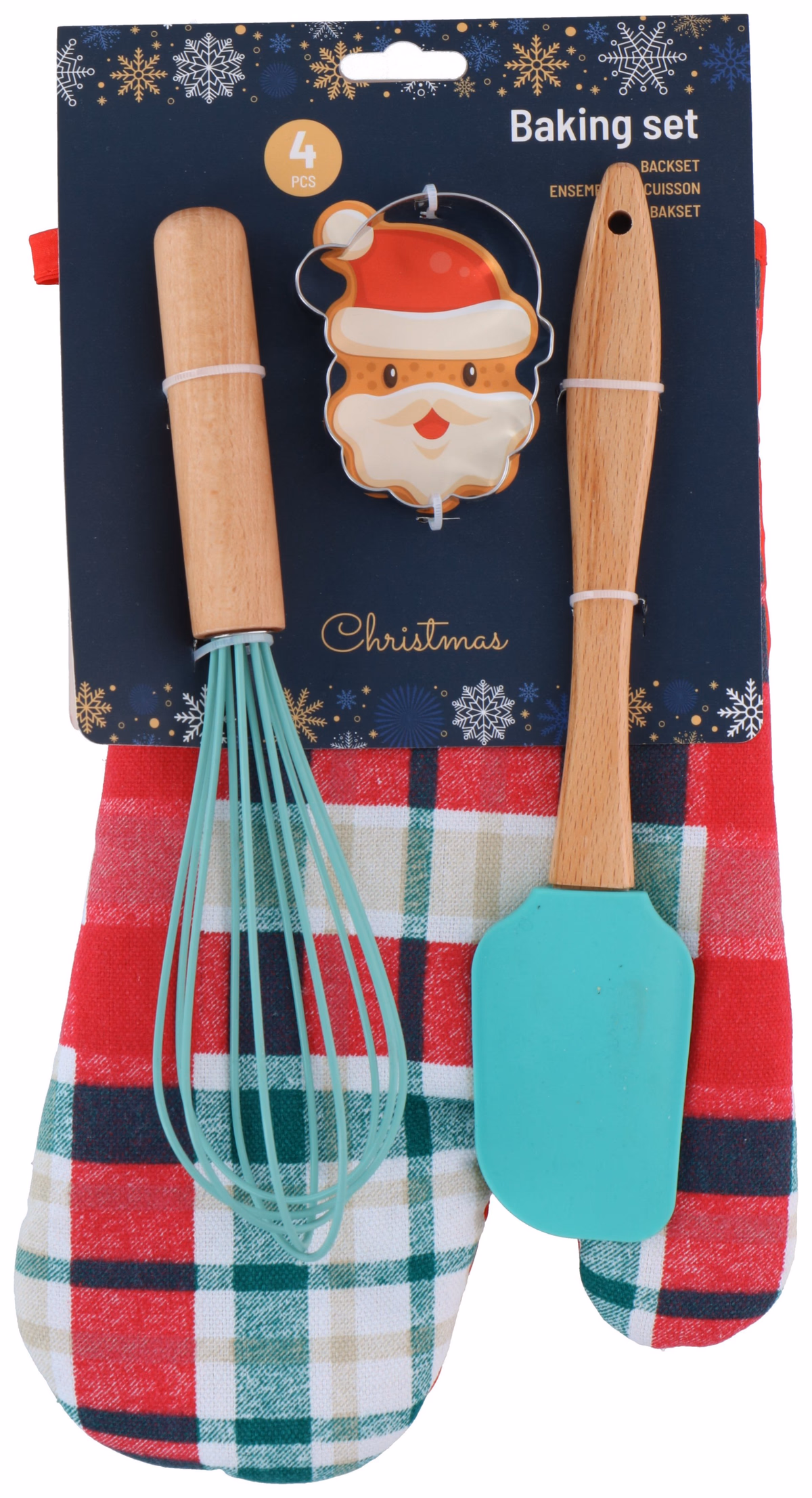 A készlet egy edényfogó kesztyűt, habverőt, spatulát és egy télapó alakú kiszúró formát tartalmaz.