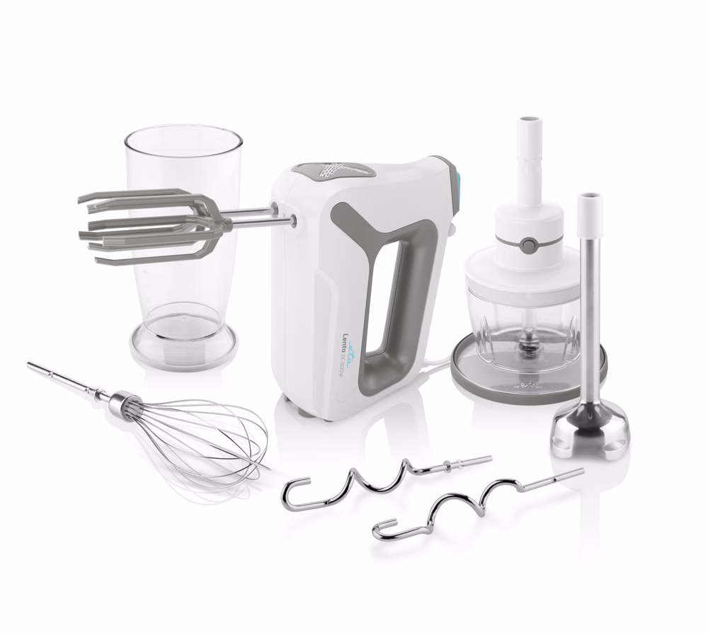 TELJESÍTMÉNYFELVÉTEL 600 W • DC motor hosszú élettartammal • Csendes működés • 4 sebesség fokozat • Maximális fordulatszámot biztosító funkció • Lapátok és horgok kioldó gombja • Túlmelegedés elleni biztonsági biztosíték • Ergonomikus fogantyú • Nagyon gyors összeszerelés, egyszerű vezérlés és könnyű karbantartás • Modern és elegáns dizájn • Tápkábel hossza 1,2 m • TARTOZÉKOK: 2 csendes lapát és 2 horog • Levehető rozsdamentes botmixer• Tojásfehérjére és tejszínhabra való habverő lapát • élelmiszer aprító • Munkaedény 500 ml kapacitással • Tartozékokra való zárható tok • SZÍN: fehér