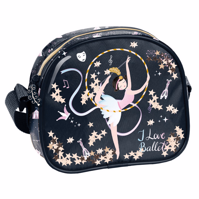 Small shoulder bag, one zipped compartment, adjustable strap, selective glitter, glitter piping.