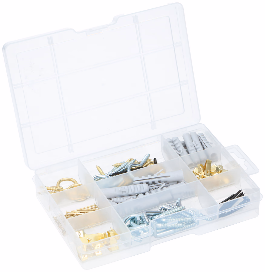 A Praktikus tároló doboz kilenc rekeszre osztott, amelyben megtalálhatók az általános igényeknek megfelelő szegek, akasztók, kampók valamint a hozzájuk illő tiplik is.