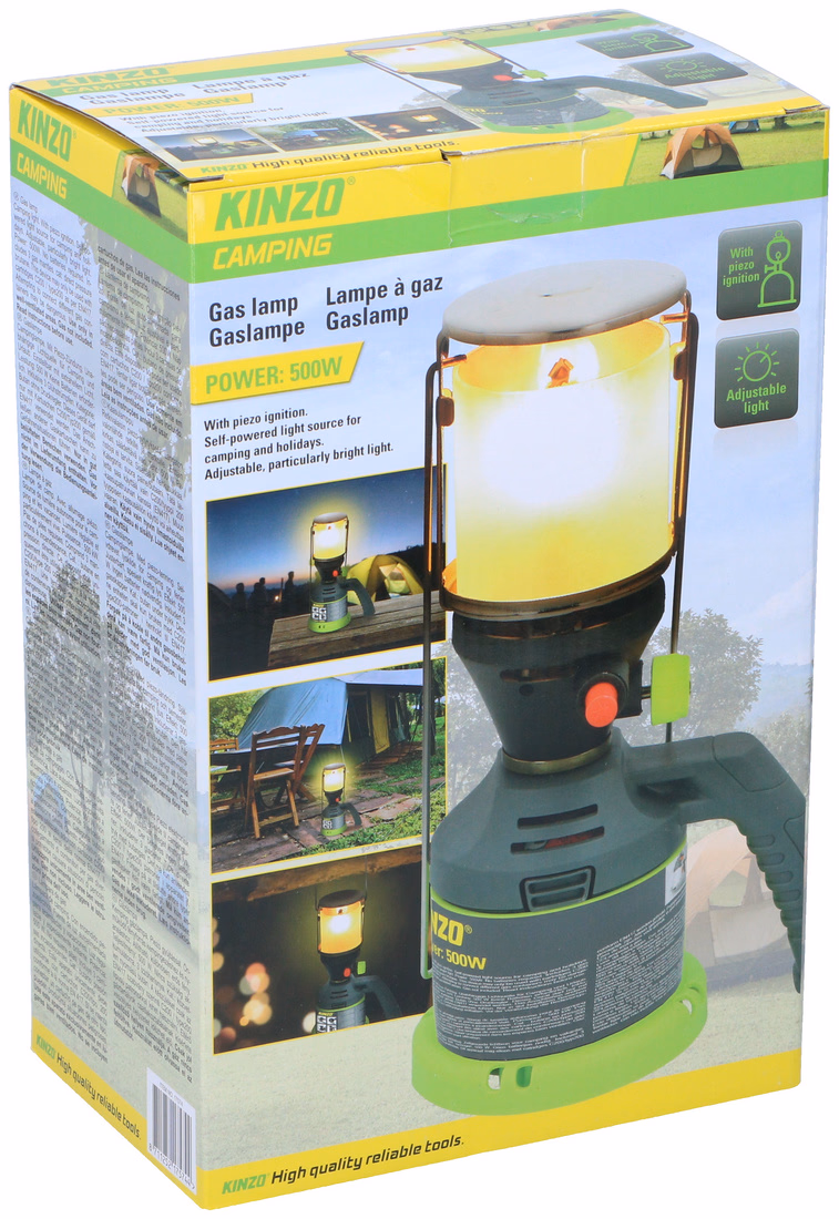 KINZO GARDEN Kemping gáz lámpa 190g, patronos, Piezo gyújtás, 3 gázégő harisnyával