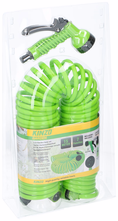 Gallery showing 1 images of KINZO GARDEN Öntöző szett 15m spirál tömlővel multifunkciós szórófejjel 3szín