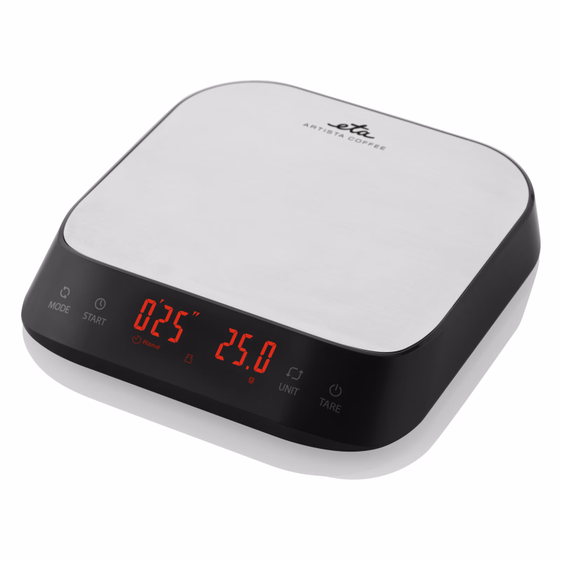 Az ETA Artista Coffee digitális mérleg 0,1 gramm pontossággal mér 1 kilogrammos határig. Az 1 kg-os határ túllépése után a felbontás 1 grammra nő, 3 kg-os maximális kapacitásig.