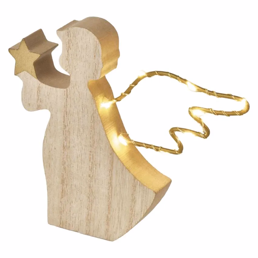 termék: angyal, fény színe: meleg fehér, méretek: 14,5 × 2 × 13 cm, használat: beltéri, időzítő, távvezérlő: nem, tápellátás típusa: elem 2× AAA (nem a csomag része), fényforrás: LED, LED-ek száma: 8, fogyasztás: 0,36 W, kimeneti feszültség: 3 V DC, védettség: IP20, élettartam: 10 000 óra, anyag: fa, garancia-időszak: 2 év, értékesítési csomagolás: 1 db, doboz