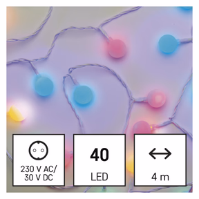 termék: lánc, fény színe: multicolor, méretek: 4 m, használat: kültéri és beltéri, időzítő, távvezérlő: nem, funkció: világít, tápellátás típusa: AC (hálózati) adapter, forma: kis golyó, LED-ek száma: 40, LED-ek közötti távolság: 10 cm, LED mérete: 25 mm, tápvezeték hossza: 5 m, a fa magasságához: 100 cm, kábel színe: fehér, fogyasztás: 3,6 W, bemeneti feszültség: 230 V AC, kimeneti feszültség: 31 V DC, csatlakoztatási lehetőség: nem, védettség: IP44, élettartam: 10 000 óra, anyag: PVC, garancia-időszak: 2 év, értékesítési csomagolás: 1 db, doboz