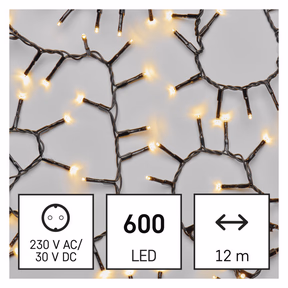 termék: sündisznó, fény színe: meleg fehér, méretek: 12 m, használat: kültéri és beltéri, időzítő, távvezérlő: nem, funkció: világít, tápellátás típusa: AC (hálózati) adapter, forma: klasszikus, LED-ek száma: 600, LED-ek közötti távolság: 2 cm, LED mérete: 3 mm, tápvezeték hossza: 5 m, a fa magasságához: nincs megadva, kábel színe: fekete, fogyasztás: 3,6 W, bemeneti feszültség: 230 V AC, kimeneti feszültség: 30 V DC, csatlakoztatási lehetőség: nem, védettség: IP44, élettartam: 10 000 óra, anyag: PVC, garancia-időszak: 2 év, értékesítési csomagolás: 1 db, doboz
