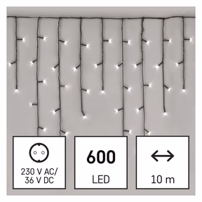 termék: jégcsap, fény színe: hideg fehér, méretek: 10 × 0,7 m, használat: kültéri és beltéri, időzítő: nem, távvezérlő: nem, funkció: 8 üzemmód (multifunkcionális), tápellátás típusa: AC (hálózati) adapter, forma: klasszikus, LED-ek száma: 600, LED-ek közötti távolság: 10 cm, LED mérete: 5 mm, tápvezeték hossza: 5 m, a fa magasságához: nincs megadva, kábel színe: zöld, fogyasztás: 9 W, bemeneti feszültség: 230 V AC, kimeneti feszültség: 31 V DC, csatlakoztatási lehetőség: nem, védettség: IP44, élettartam: 10 000 óra, anyag: PVC, garancia-időszak: 2 év, értékesítési csomagolás: 1 db, doboz