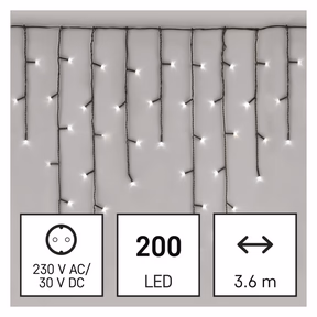 termék: jégcsap, fény színe: hideg fehér, méretek: 3,6 m, használat: kültéri és beltéri, időzítő: nem, távvezérlő: nem, funkció: 8 üzemmód (multifunkcionális), tápellátás típusa: AC (hálózati) adapter, forma: klasszikus, LED-ek száma: 200, LED-ek közötti távolság: 10 cm, LED mérete: 5 mm, tápvezeték hossza: 5 m, a fa magasságához: nincs megadva, kábel színe: zöld, fogyasztás: 3,6 W, bemeneti feszültség: 230 V AC, kimeneti feszültség: 31 V DC, csatlakoztatási lehetőség: nem, védettség: IP44, élettartam: 10 000 óra, anyag: PVC, garancia-időszak: 2 év, értékesítési csomagolás: 1 db, doboz