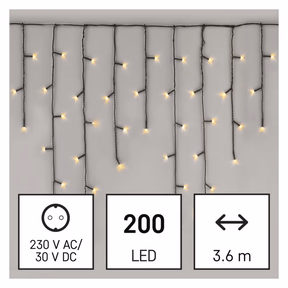 termék: jégcsap, fény színe: meleg fehér, méretek: 3,6 m, használat: kültéri és beltéri, időzítő: nem, távvezérlő: nem, funkció: 8 üzemmód (multifunkcionális), tápellátás típusa: AC (hálózati) adapter, forma: klasszikus, LED-ek száma: 200, LED-ek közötti távolság: 10 cm, LED mérete: 5 mm, tápvezeték hossza: 5 m, a fa magasságához: nincs megadva, kábel színe: zöld, fogyasztás: 3,6 W, bemeneti feszültség: 230 V AC, kimeneti feszültség: 31 V DC, csatlakoztatási lehetőség: nem, védettség: IP44, élettartam: 10 000 óra, anyag: PVC, garancia-időszak: 2 év, értékesítési csomagolás: 1 db, doboz