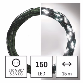 termék: nano lánc, fény színe: hideg fehér, méretek: 15 m, használat: kültéri és beltéri, időzítő, távvezérlő: nem, funkció: világít, tápellátás típusa: AC (hálózati) adapter, forma: nano, LED-ek száma: 150, LED-ek közötti távolság: 10 cm, LED mérete: 3 mm (nano), tápvezeték hossza: 5 m, a fa magasságához: 170 cm, kábel színe: zöld, fogyasztás: 2,7 W, bemeneti feszültség: 230 V AC, kimeneti feszültség: 4,5 V DC, csatlakoztatási lehetőség: nem, védettség: IP44, élettartam: 10 000 óra, anyag: fém, garancia-időszak: 2 év, értékesítési csomagolás: 1 db, doboz