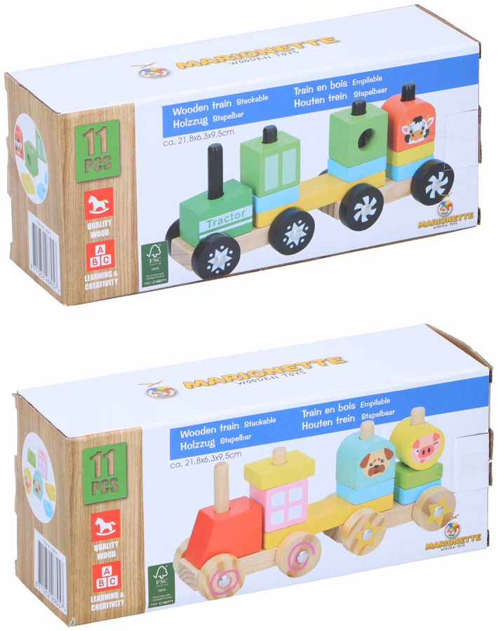 MARIONETTE WOODEN TOYS Fa építőjáték vonat 10 részes 2 féle