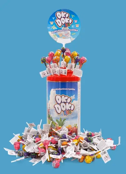 OKI DOKI KIDS vitaminokkal és ásványi anyagokkal dúsított eper, narancs, ananász és trópusi ízesítésű, étrend-kiegészítő nyalóka. A 3 évesnél idősebb gyermekek és felnőttek számára készült nyalóka 15-féle vitamint és ásványi anyagot tartalmaz. A 100 db multivitaminos nyalókát rejtő promóciós henger OGYÉI regisztrációval rendelkezik. A nyalókák külön vonalkóddal vannak ellátva, ezzel is segítve az egyedi értékesítést.