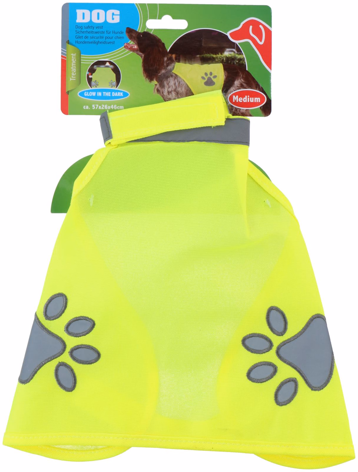 Kutya biztonsági láthatósági mellény, fényvisszaverő csíkkal és fényvisszaverő tappancs mintával.