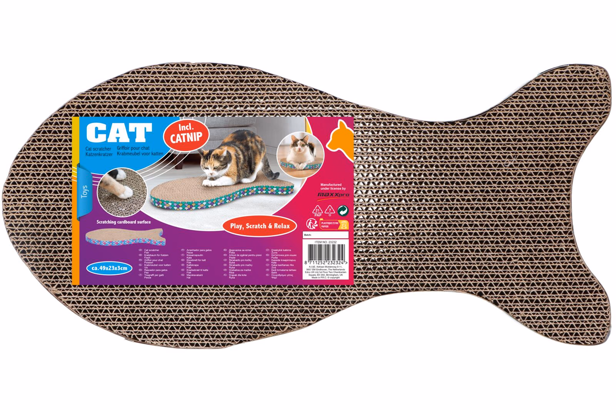 PET TOYS Macskajáték kaparó, hal forma, macskagyökérrel 49x23x3cm 2 színben