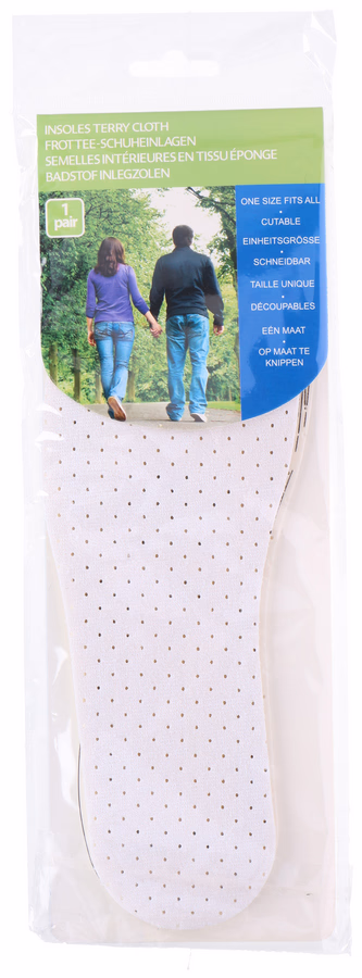 Természetes pamut-frottír és latex habból készült talpbetét a perforációin keresztül jól szellőzik és a frottír nedvszívó képessége révén a láb kevésbé izzad a cipőben.