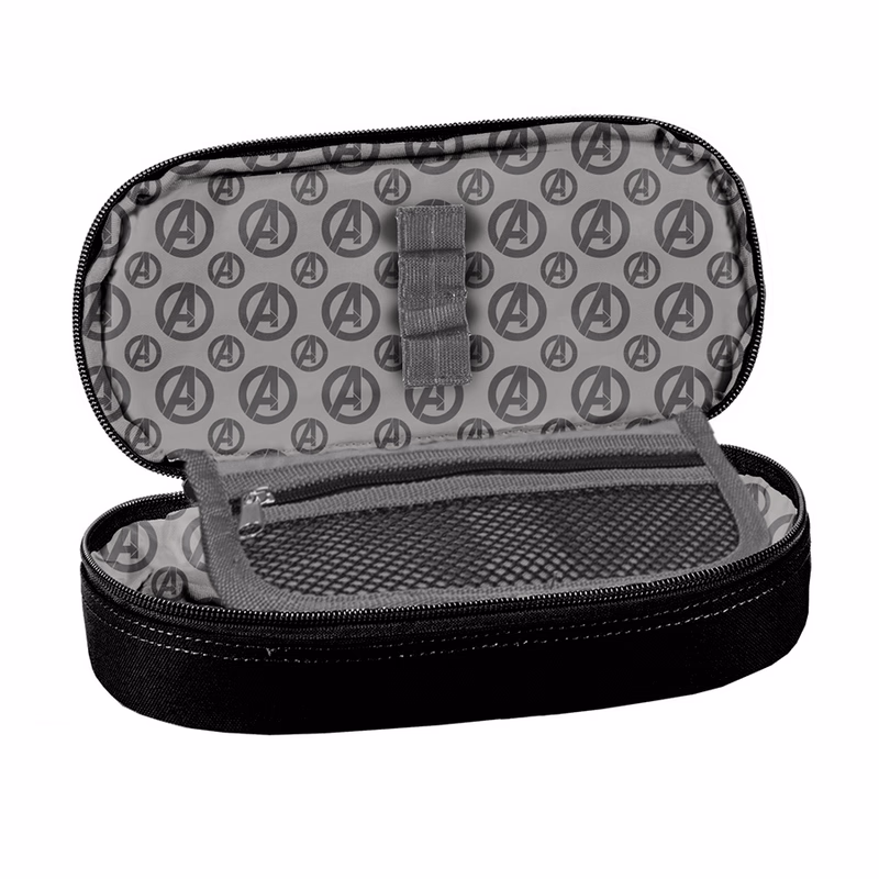 Avengers mintás ovális tolltartó, mely dupla cipzárral záródik. Belseje egy rekeszes, ahová a különböző formájú egyéb eszközök rögzítés nélkül tehetőek. A fedél alatt lehetőség van 4 írószer gumipánttal történő rögzítésére. A belső fülön egy hálós, cipzáras zseb is található, ahová kisebb eszközök helyezhetők. Jellemzői: egy nagy rekesszel írószerrögzítő pánt cipzáras zseb cipzáras Mérete: 23x10x6 cm