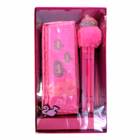 glitter PVC pencil case+pompon pen with PU ending in a color gift box
