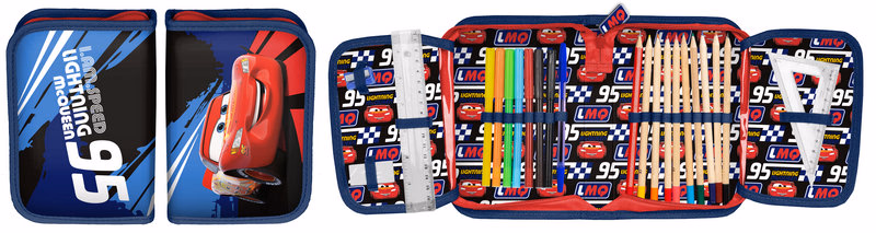 Pencil case with stationery (pen, pencil, seven felt-tip pens, nine crayons, rubber, ruller, pencil sharpener, set square, timetable, multiplication board).