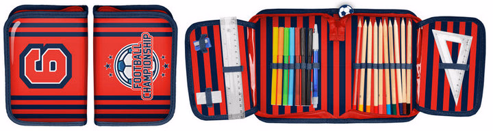 Pencil case with stationery (pen, pencil, seven felt-tip pens, nine crayons, rubber, ruller, pencil sharpener, set square, timetable, multiplication board).