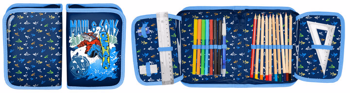 Pencil case with stationery (pen, pencil, seven felt-tip pens, nine crayons, rubber, ruller, pencil sharpener, set square, timetable, multiplication board)