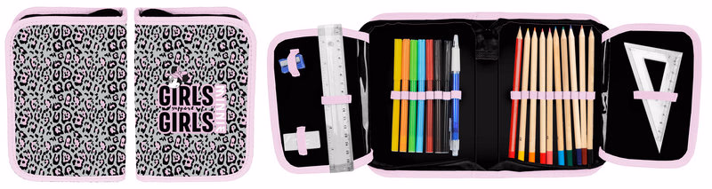 A tolltartó belsejében színes gumipántok alá rögzíthetőek az írószerek, és helyet kapott benne négy nagyobb pánt is, a radír, hegyező, vonalzó tárolására.