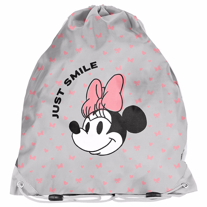 Szűrke anyagában mintás kis masnis tornazsák a praktikus megoldások kedvelőinek, figyelemfelkeltő Minnie logóval. A hátizsák húzózsinórokkal záródik. A zsinórok egyszerű és gyors hozzáférést biztosítanak a zsák belsejéhez. A vállpánt zsinórok duplázottak, így a zsák hordható háton és a vállakon is. A tornazsák mosható, könnyen száradó anyagból készült. Mérete: 38x34 cm