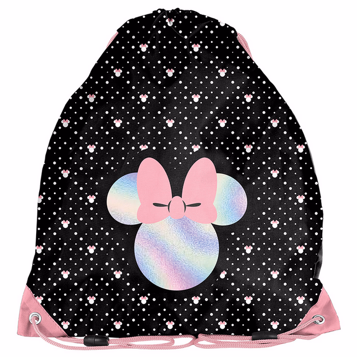 A praktikus megoldások kedvelőinek ajánljuk ezt a tornazsákot, amely fekete pöttyös és rózsaszín Minnie emblémával díszített.
