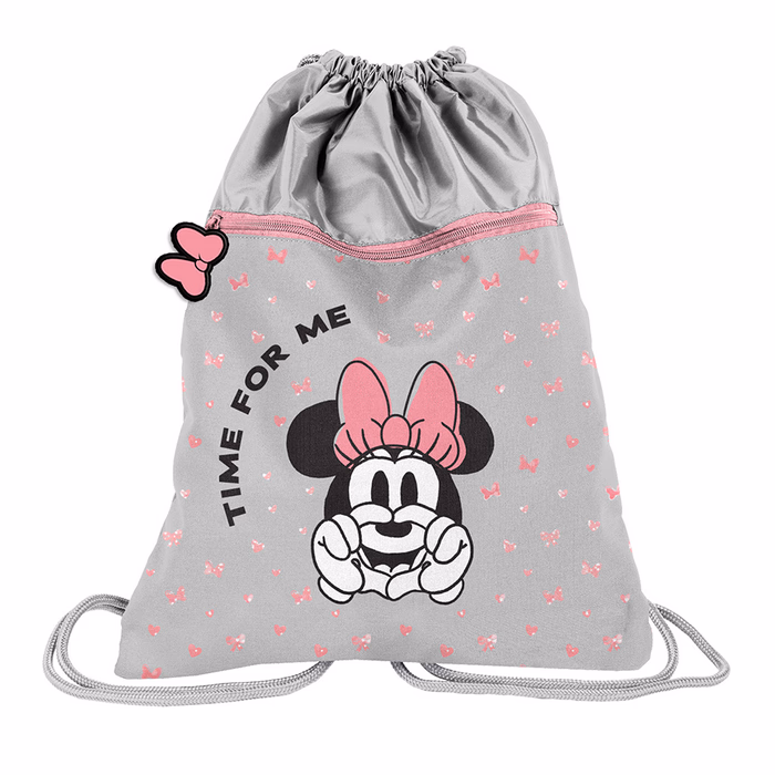 Ez a prémium szürke tornazsák apró rózsaszín masnikokkal és Minnie egér ikonnal van díszítve.