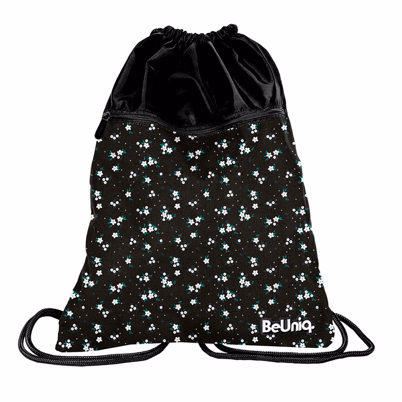 Prémium Fekete tornazsák virág mintákkal, amely egy elülső cipzáras zsebbel rendelkezik.