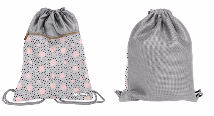 Szürke alapon rózsaszin pöttyös tornazsák, amely egy elülső cipzáras zsebbel rendelkezik.