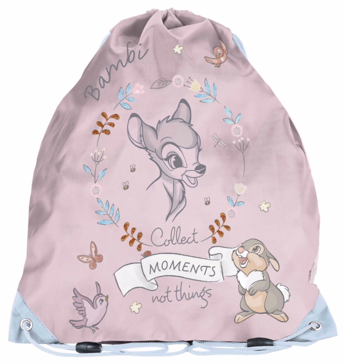 Divatos rózsaszín és világoskék Bambis tornazsák a praktikus megoldások kedvelőinek. A hátizsák húzózsinórokkal záródik. A zsinórok egyszerű és gyors hozzáférést biztosítanak a zsák belsejéhez. A vállpánt zsinórok duplázottak, így a zsák hordható háton és a vállakon is. A tornazsák mosható, könnyen száradó anyagból készült. Mérete: 38x34 cm Anyaga: Poliészter
