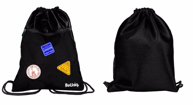 Shoe bag, one main compartment, front pocket with zipper, mash on back in color, beuniq lining.
