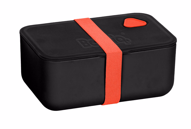 Lunch box with elastic band that prevents uncontrolled opening of the box. It also has a silicone gasket around the lid.