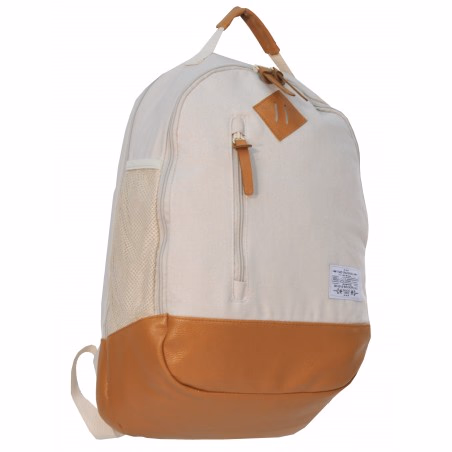 Canvas collection backpack, two compartments, one for laptop, two mesh side pockets, small zipped front pocket, profiled mesh shoulder straps, bottom, trimmings, pullers and carry handle made of PU leather